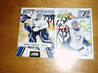 Glad to see this one come back. I didnt expect to see it come back because he is such a prized prospect of the Lightning. We should be seeing a bit of a goalie compettition between Dustin and Dwayne Roloson. I love the personalization. Seems like a great kid and hopes he has a nice long career in the leauge. Also he was nice enough to send a card of his own. I love these hot rookie cards. Great return. For some strange reason the return came back with Canadian postage, when I mailed it to Tampa and with a U.S stamp. Thankfully Tokarski went out of his way to get these back to me. Card was mailed to the Tampa Bay Lightning.